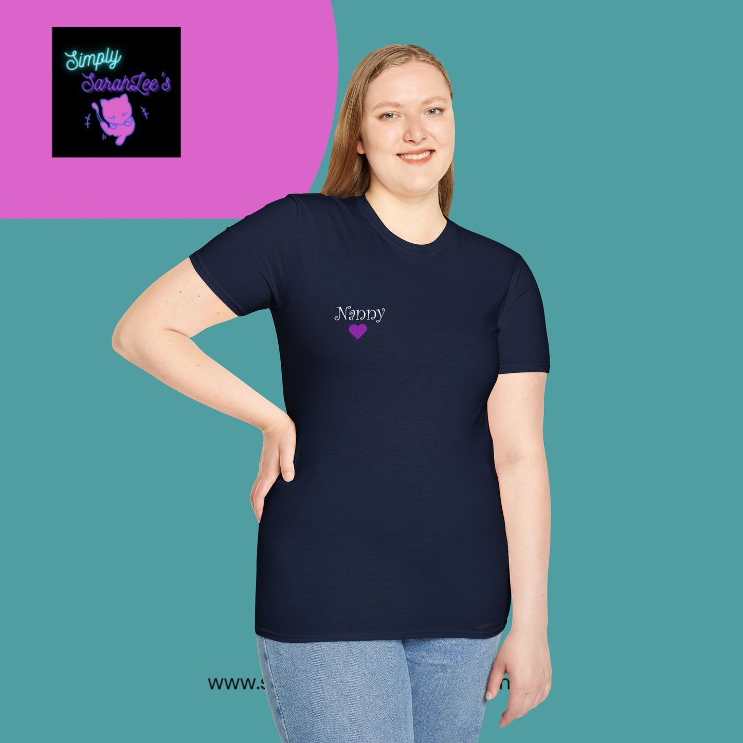 ASL Hands saying Nanny on Front and back with purple and grey hearts Unisex Softstyle T-Shirt