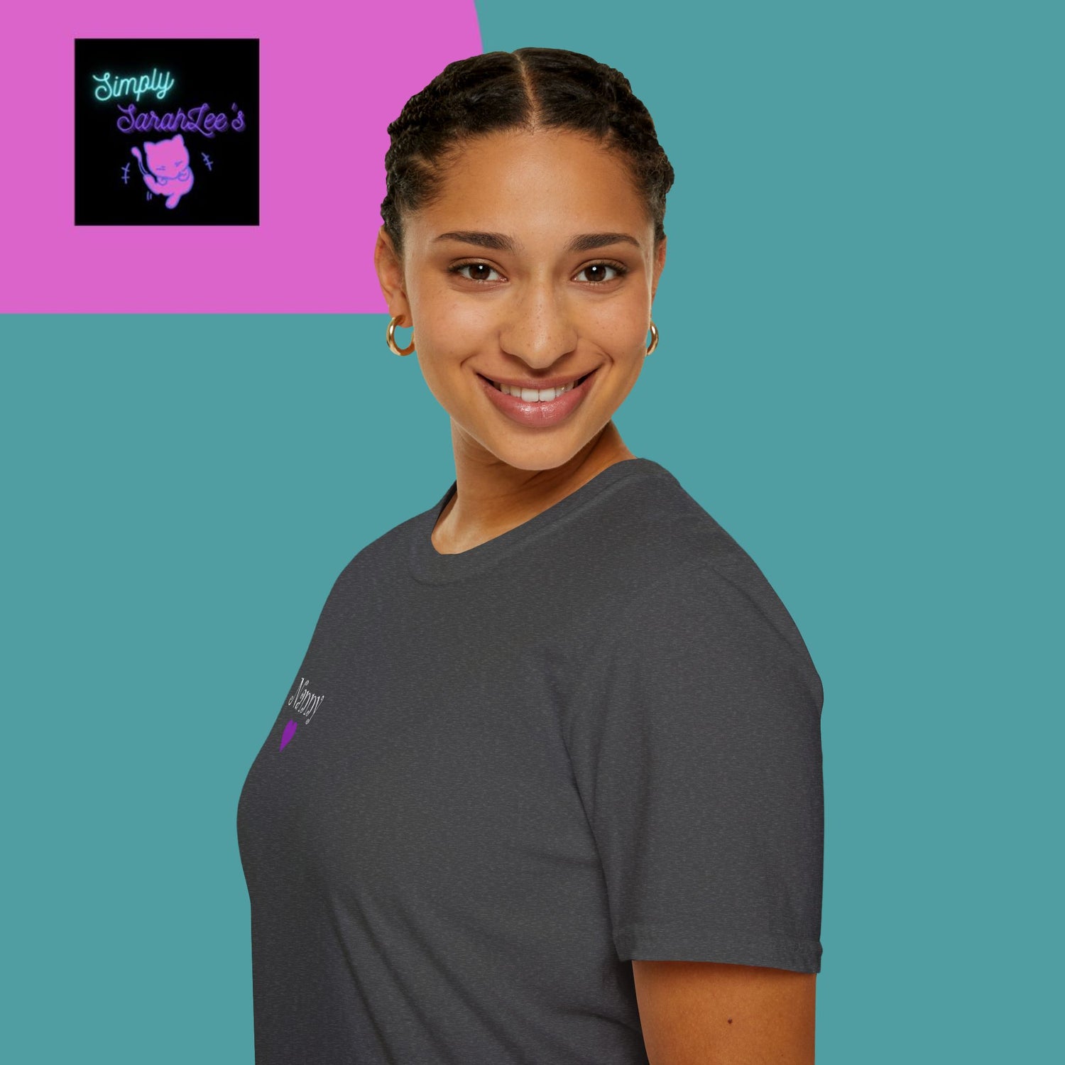 ASL Hands saying Nanny on Front and back with purple and grey hearts Unisex Softstyle T-Shirt